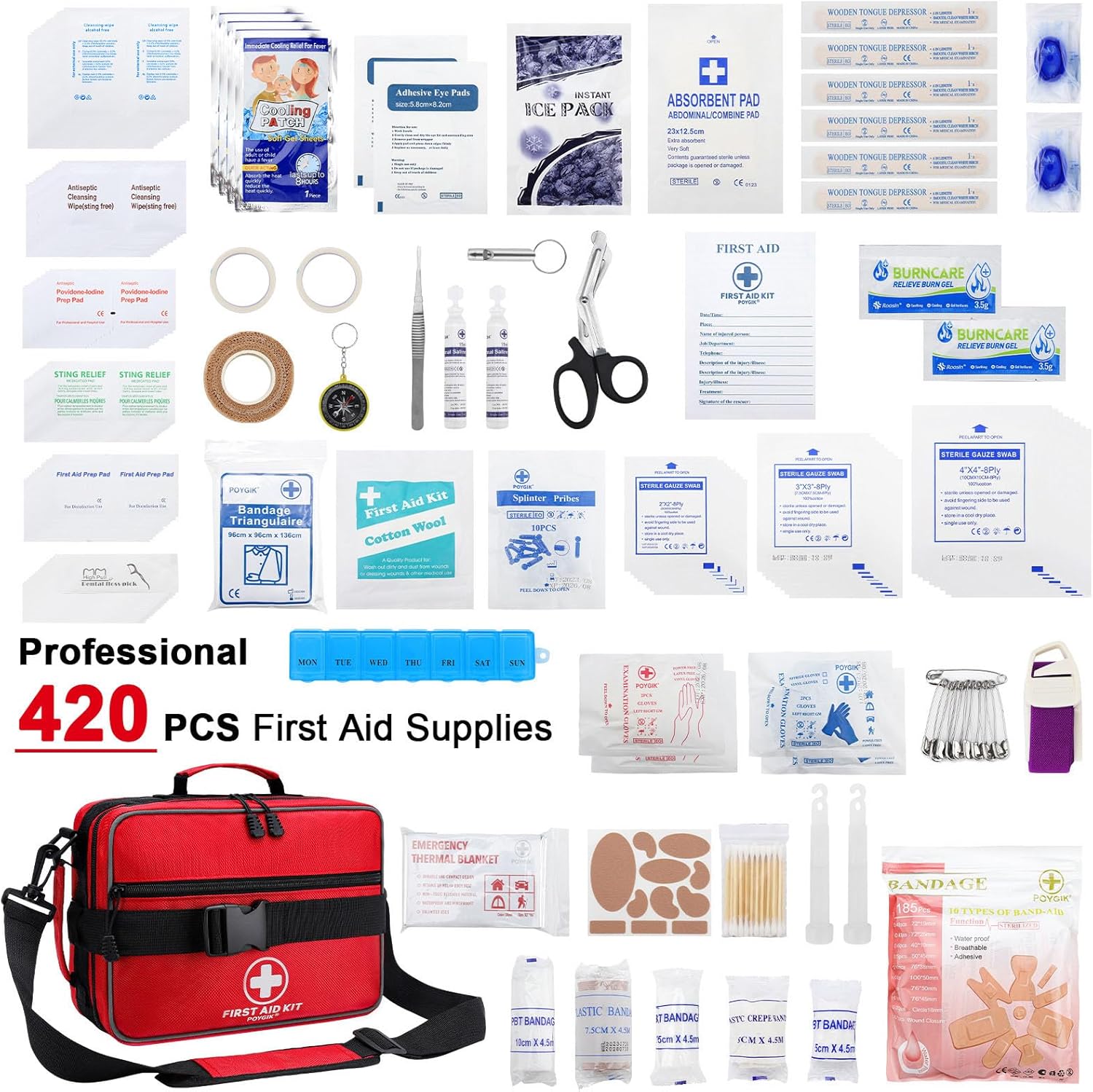 This kit includes all kinds of bandages, emergency blanket, Metal Scissors, 7 Days Pill Box and total 420 pieces of accessories, which can be used for the care for small injuries, cuts, scrapes and burns.