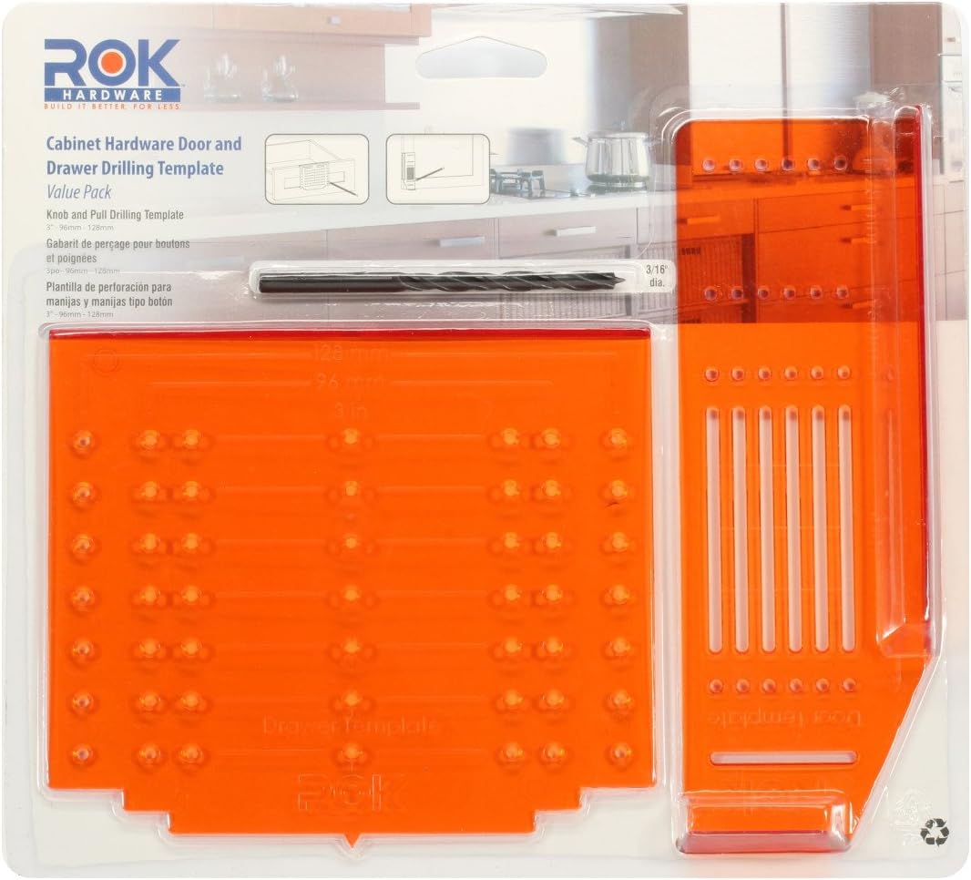 KIT INCLUDES: (1) Knob Drilling Template | (1) Pull Drilling Template | (1) 3/16″ Drill bit
