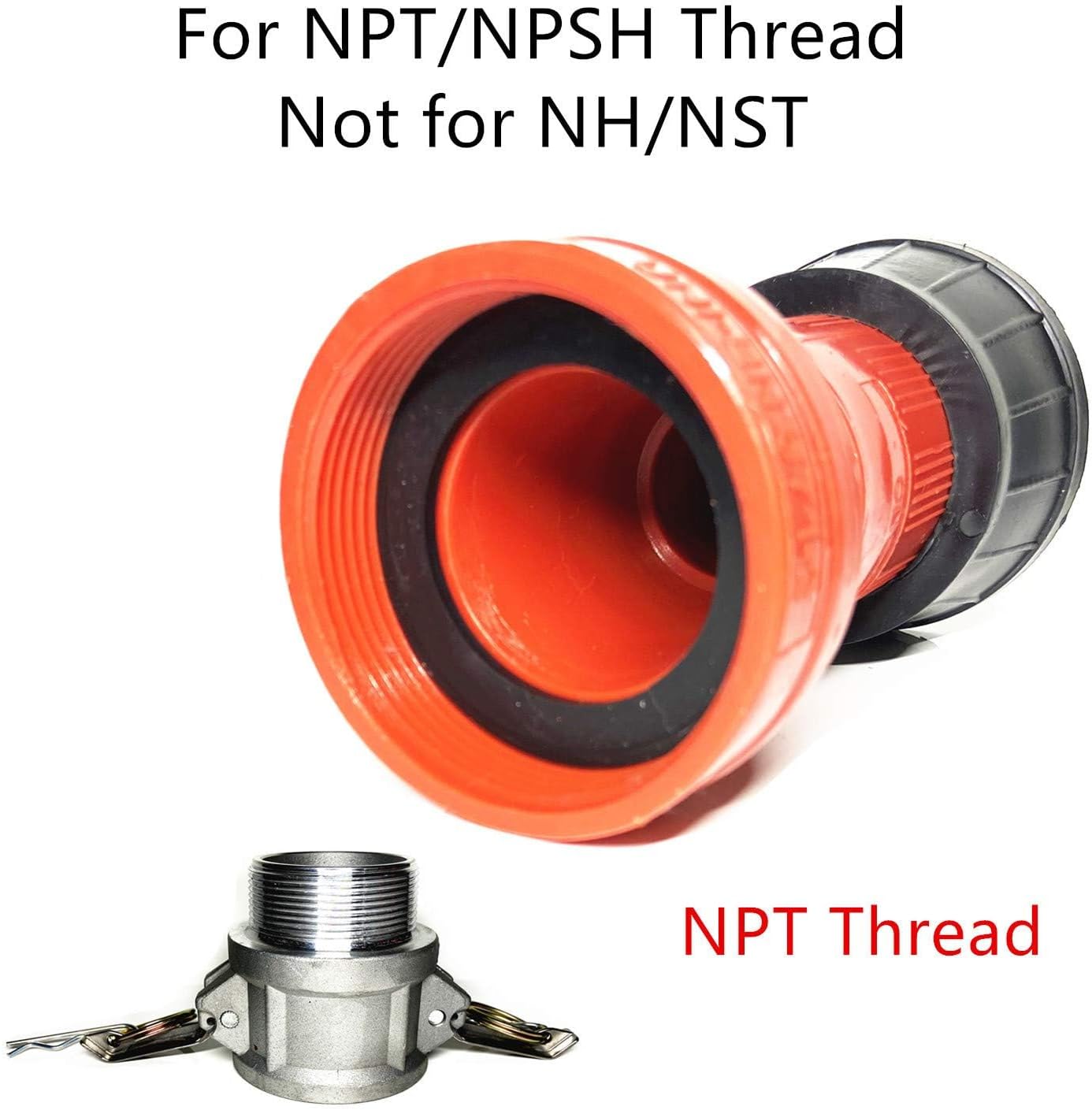 NH / NST: The most common thread type in use by fire departments today is NST or National Standard Thread. NST also goes by the initials NH or National Hose. It can even be referred to as NHT or National Hose Thread. But NST or NH is more common these days. NH = NST.NPSH: National Pipe Straight Hose (NPSH) or Iron Pipe Thread (IPT) has the same threads per inch (TPI) as National Pipe Tapered (NPT) but the thread does not taper. NPSH is a straight thread and seals by a gasket in the female coupling which allows for a swivel, just like NH / NST, which make both ideal for hose couplings. Warning – It will NOT thread into a female NPT pipe. For example, a male NPSH coupling will NOT thread into a female metal or pvc pipe.NPT: National Pipe Tapered is common in plumbing and some industrial uses. Sometimes referred to as pipe thread because PVC pipe and schedule 40 pipe are typically threaded in NPT. As its name implies this is a tapered thread so that the outside diameter of the male (ODM) gets smaller towards the end of the fitting and the inside diameter of the female narrows with depth. As the two fittings are threaded together the opposite tapers force thread friction and makes the seal without the use of a gasket.