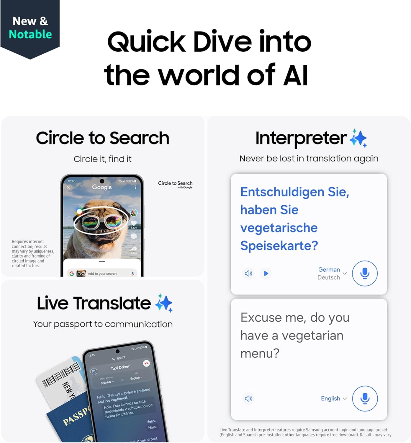 ¹Requires Samsung account login and internet connection. Editing with Generative Edit results in a resized photo up to 12MP. ²Galaxy AI features by Samsung will be provided for free until the end of 2025 on supported Samsung Galaxy devices. ³Instant Slow-Mo available only with videos saved in the Samsung gallery app, recorded at up to 4K@60fps (not available with HDR10+ videos). ⁴Based on average battery life under typical conditions. Average expected performance based on typical use. Actual battery life depends on factors such as network, features selected, frequency of calls and voice, data, and other application usage patterns. Results may vary. ⁵Requires Samsung account login and language preset (English and Spanish pre-installed; other languages require free download). Results may vary.⁶Products sold separately. ⁷Energy Score Insights track data and require compatible Galaxy AI phone, Samsung Health app, and Samsung account. ⁸Quick Share between Galaxy devices available with the following OS: smartphones and tablets with Android OS version 10.0 (Q) and One UI 2.1 or above, PCs running Windows 10 or later. Requires Samsung account, Wi-Fi and Bluetooth connections between devices. ⁹Requires internet connection; results may vary by uniqueness, clarity and framing of circled image and related factors.