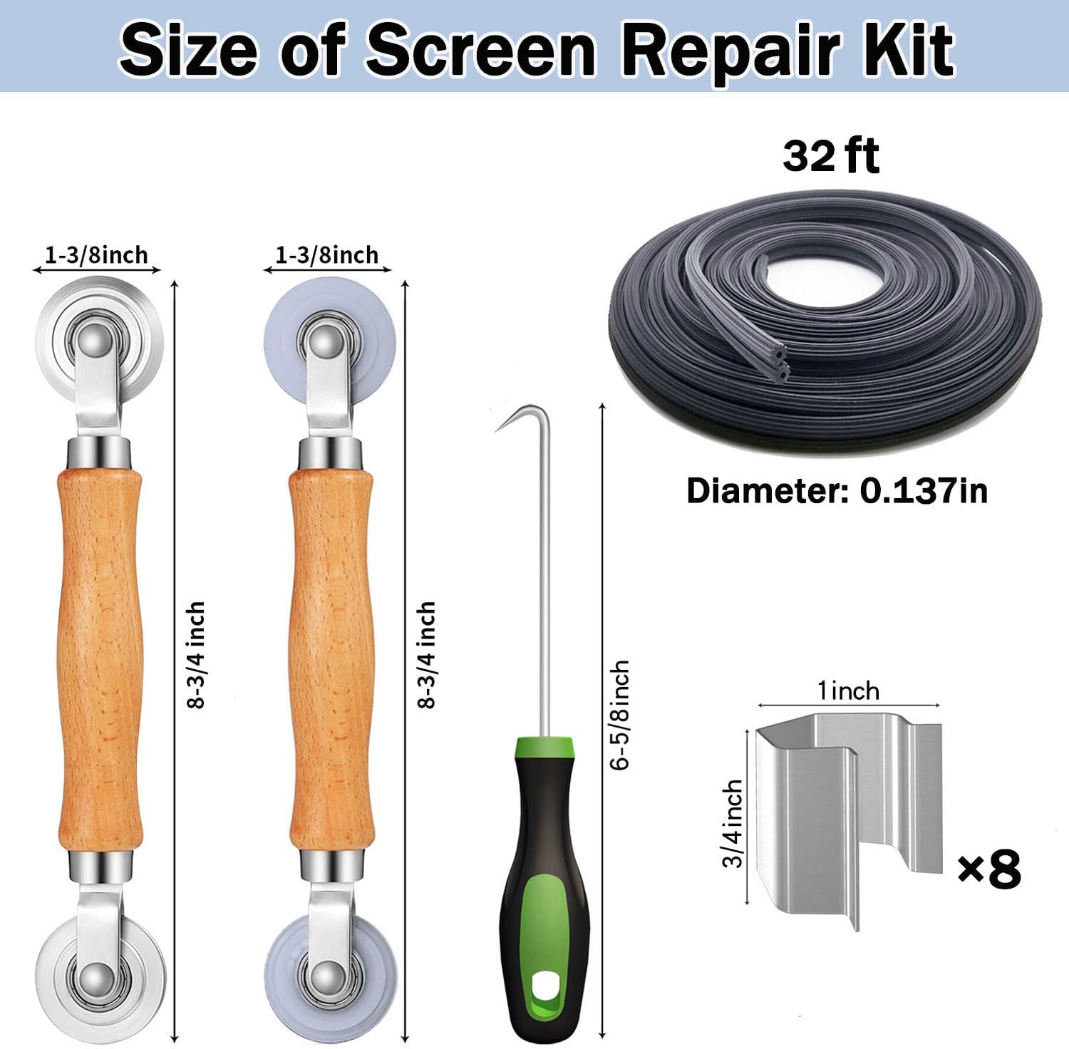 Screen Repair kit, Screen Roller Tool, Steel/Nylon Roller with Bear+8pcs Screen Clips+32ft Screen Spline+Removal Hook, 5 in 1 Window Screen Door Repair Kit,for Installing Door Window Mesh