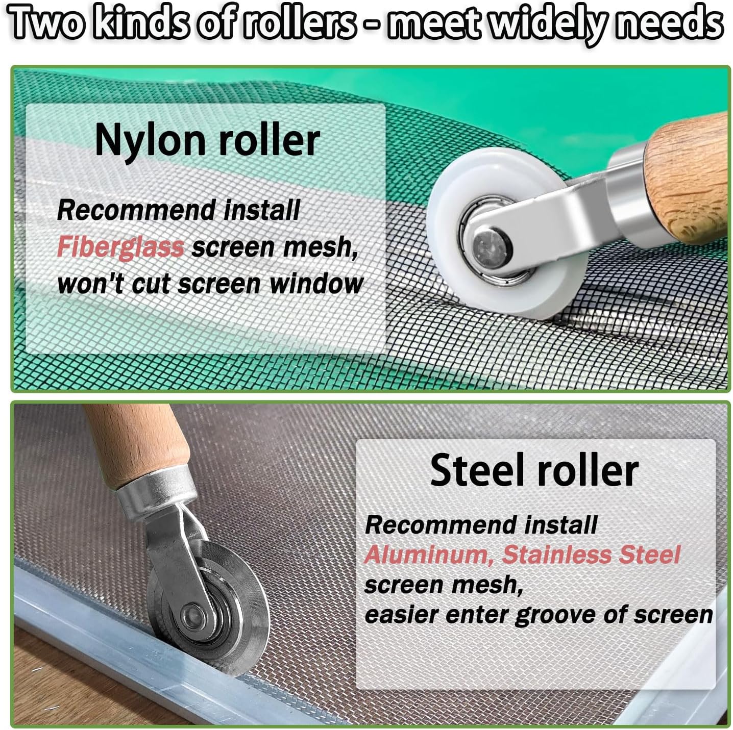 🏠【2 x DIFFERENT BEARING ROLLER】Our kit includes steel roller and nylon roller. Solid wood handle + double carbon steel bearing wheels. which is stronger, smoother, and has a longer service life. Metal roller -Recommended to install metal mesh. Nylon roller-Recommended to install fiberglass mesh, The screen rolling tool has a double side, convex wheel, and concave wheel. Two kinds of rollers can meet a wider range of needs.