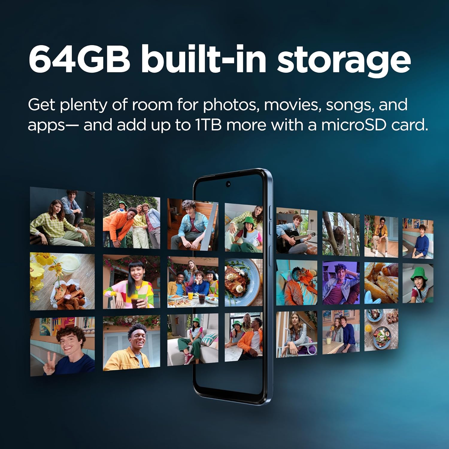5,000mAh battery for up to 46 hours of battery life. / 64GB of storage + 1TB more with microSD card. / 4GB RAM, expandable up to 6GB with RAM Boost.