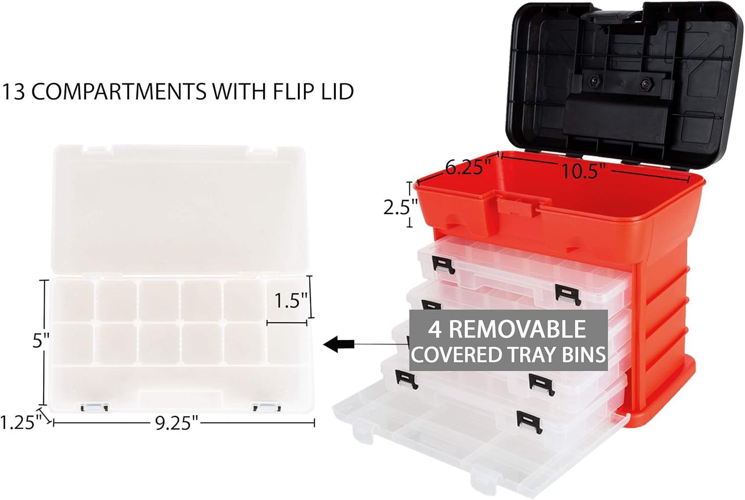 SECURE LATCH CLOSURE FOR EACH SECTION – In addition to dedicated flip lids on all storage sections, this parts organizer box keeps all your important supplies sorted inside with a secure front lid that keeps all four removable compartments in place.