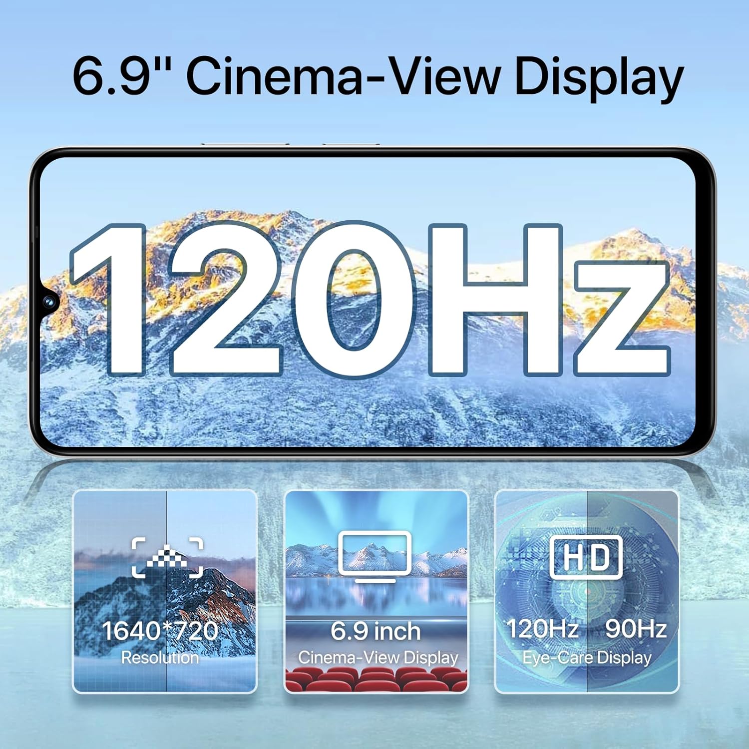 𝟭𝟮𝟬𝗛𝘇 & 𝟲.𝟵 𝗛𝗗+ 𝗗𝗶𝘀𝗽𝗹𝗮𝘆: UMIDIGI G100A unlocked android phone features a 6.9-inch cinematic display with a 120Hz refresh rate, delivering an incredibly smooth visual and touch experience