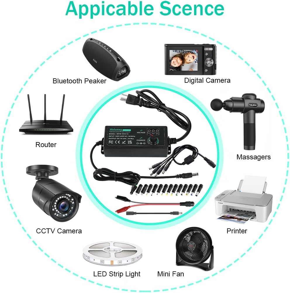 Wide Range of Applications: The 72W all-in-one multipurpose AC/DC adapter fit for many 3~24V small household electronics such as LED strips, 3D printer, TV Box, smart speaks, wireless routers, essential oil diffuser humidifier, USB fan, Wifi camera, USB Hub, hard disk box, DC motor, DC pump, digital photo frame, DVR NVR surveillance system etc.For indoor use only. (Check dc jack before buy: 5.5×2.5mm, compatible 5.5×2.1mm)