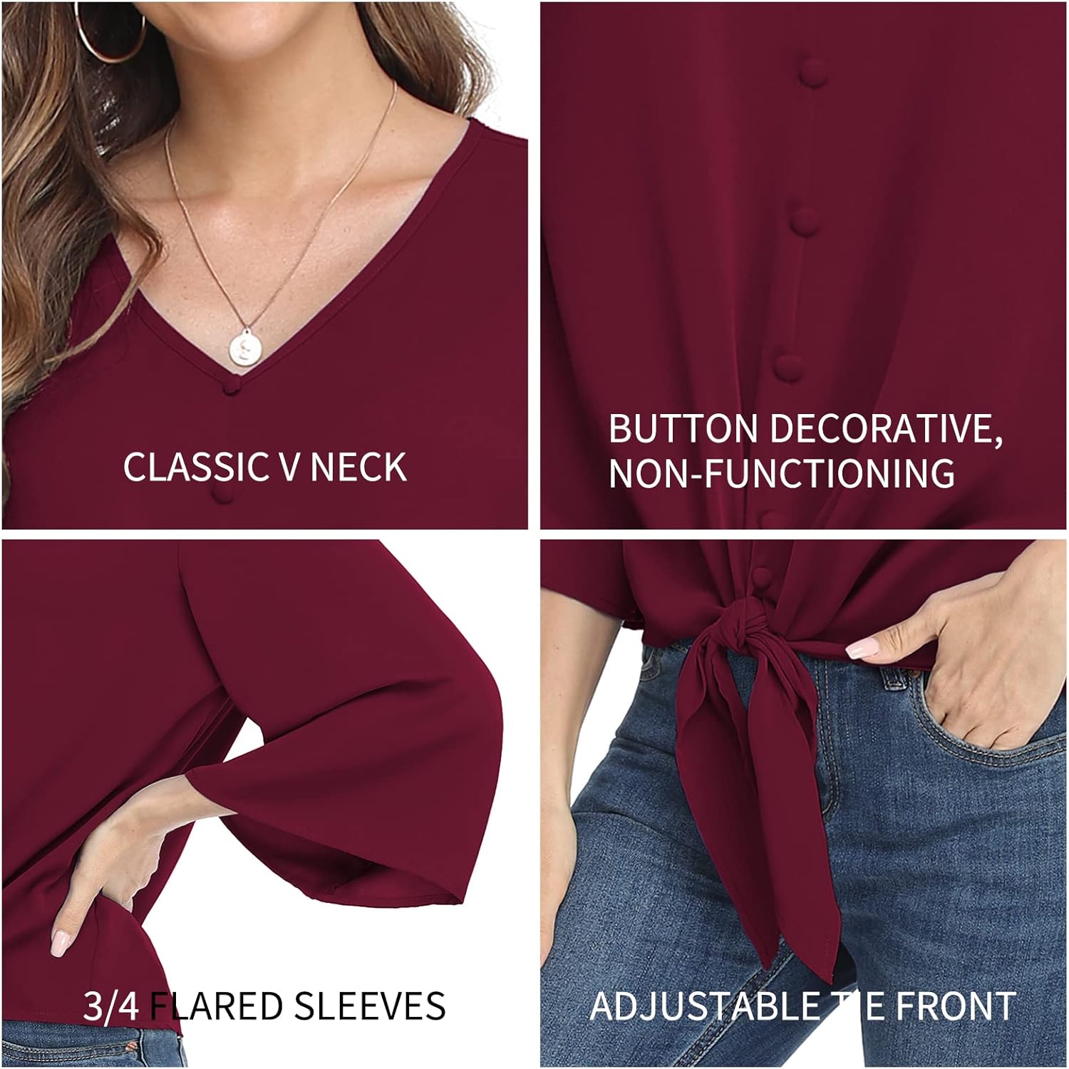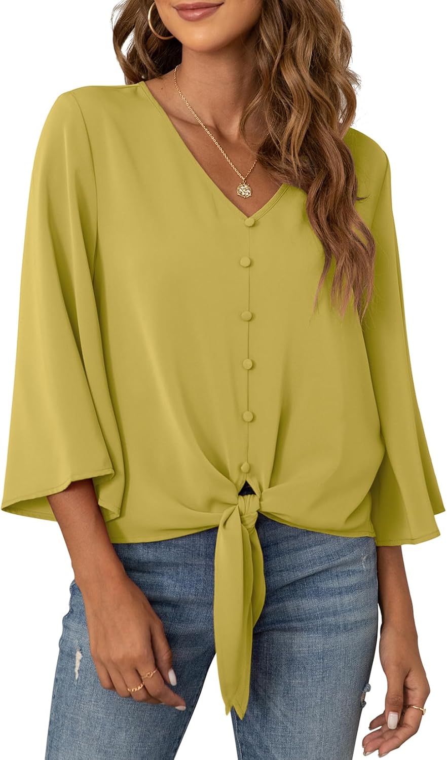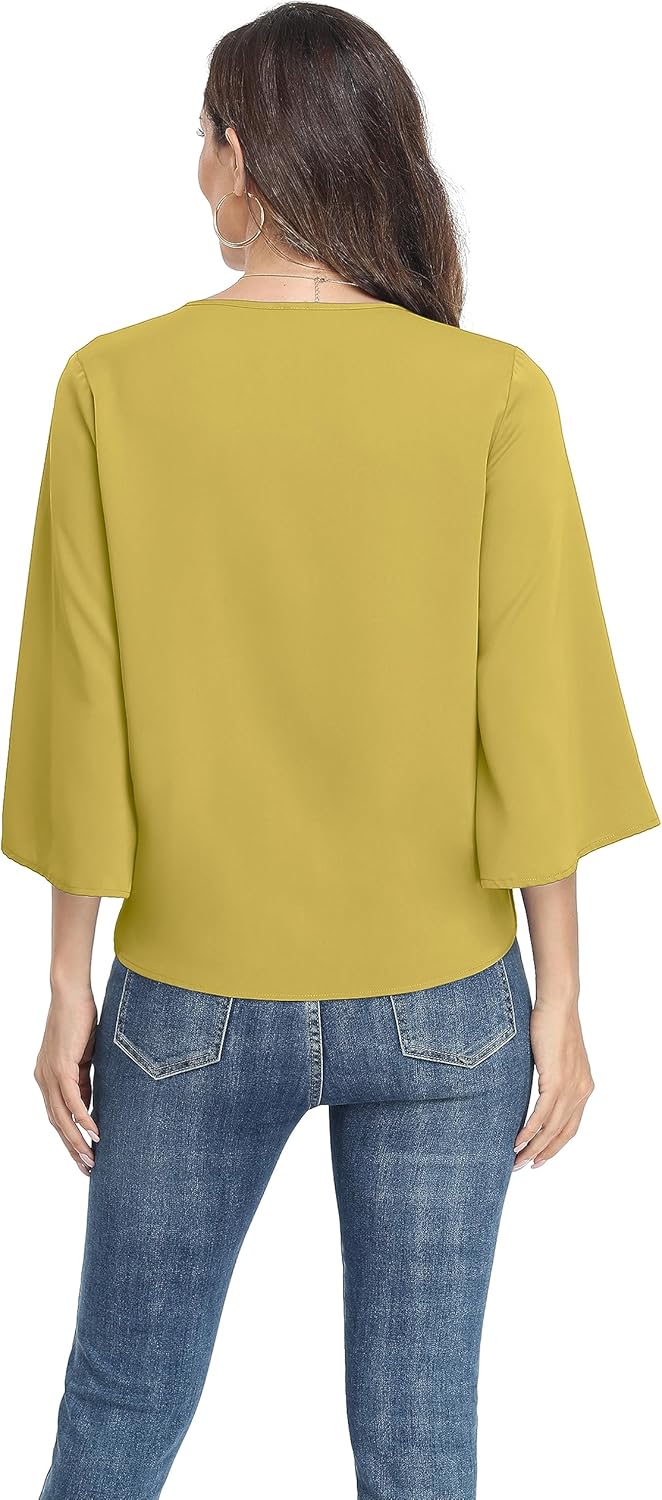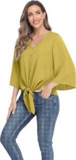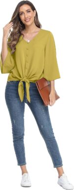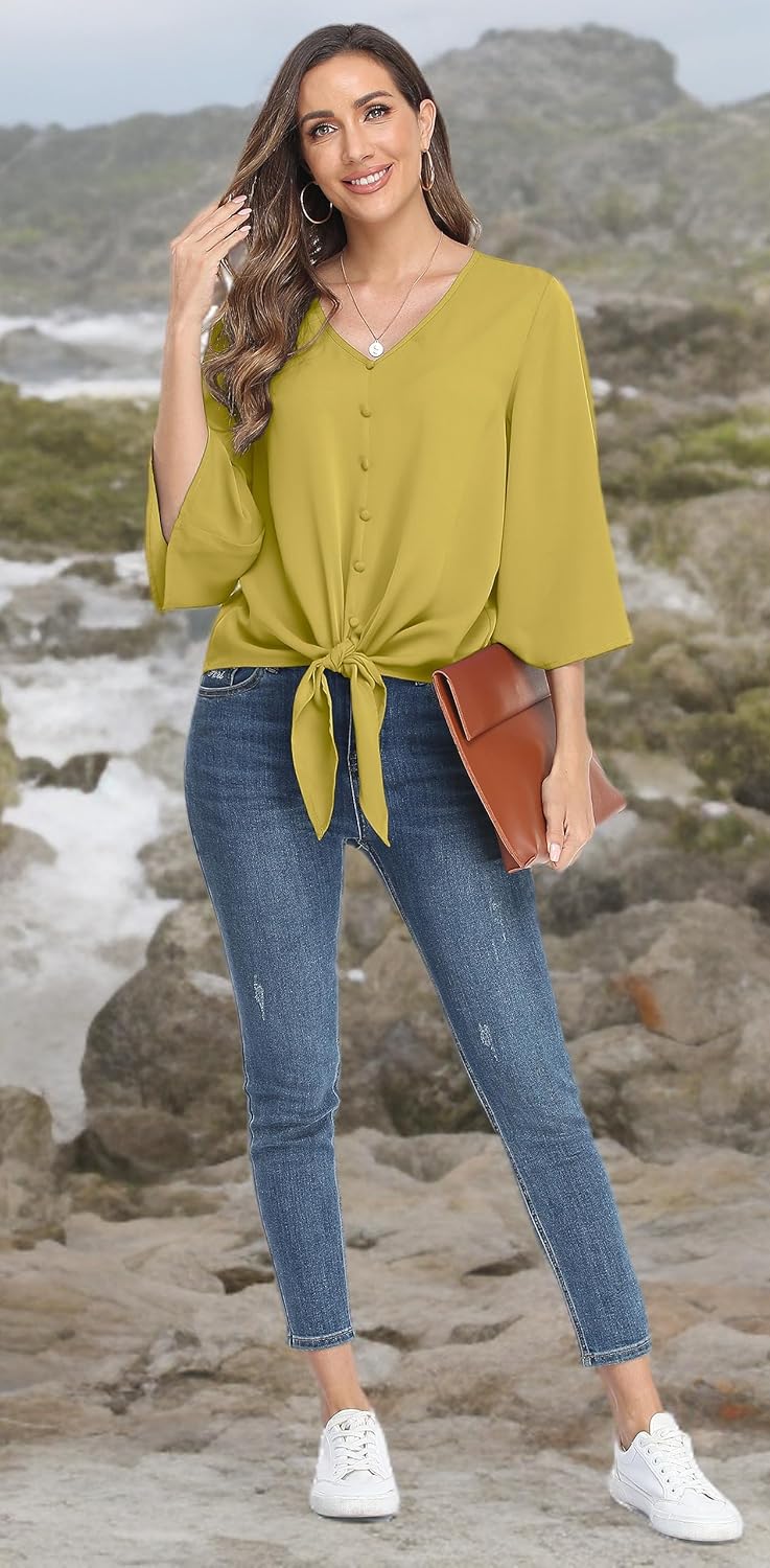 VIISHOW Women’s Button V Neck Chiffon Tops 3/4 Bell Sleeve Tie Knot Casual Blouses Loose Summer Shirts
