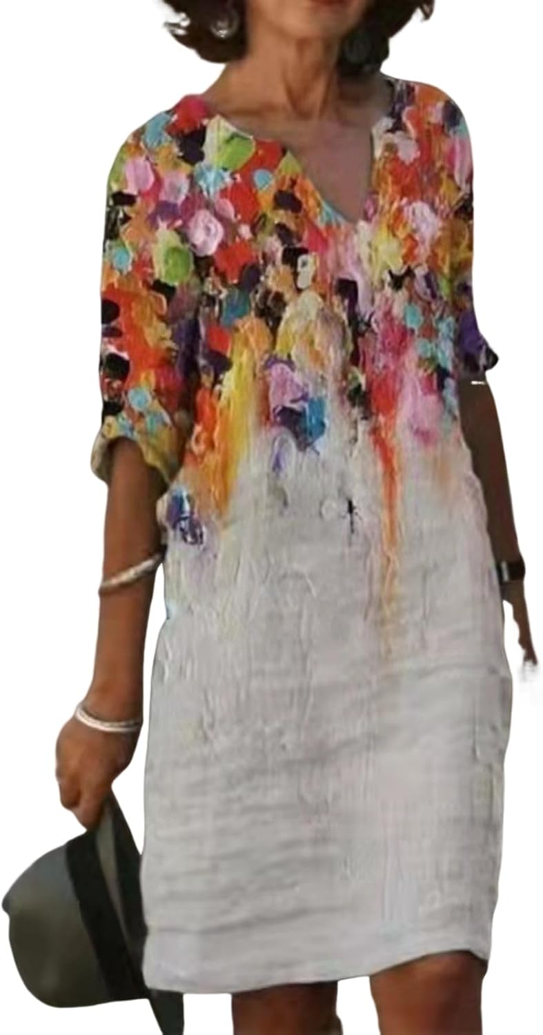 Women’s Fashion Linen Boho Floral Short Dress Elegant Casual Half Sleeve Dresses Pullover V Neck Vintage Dresses for Women