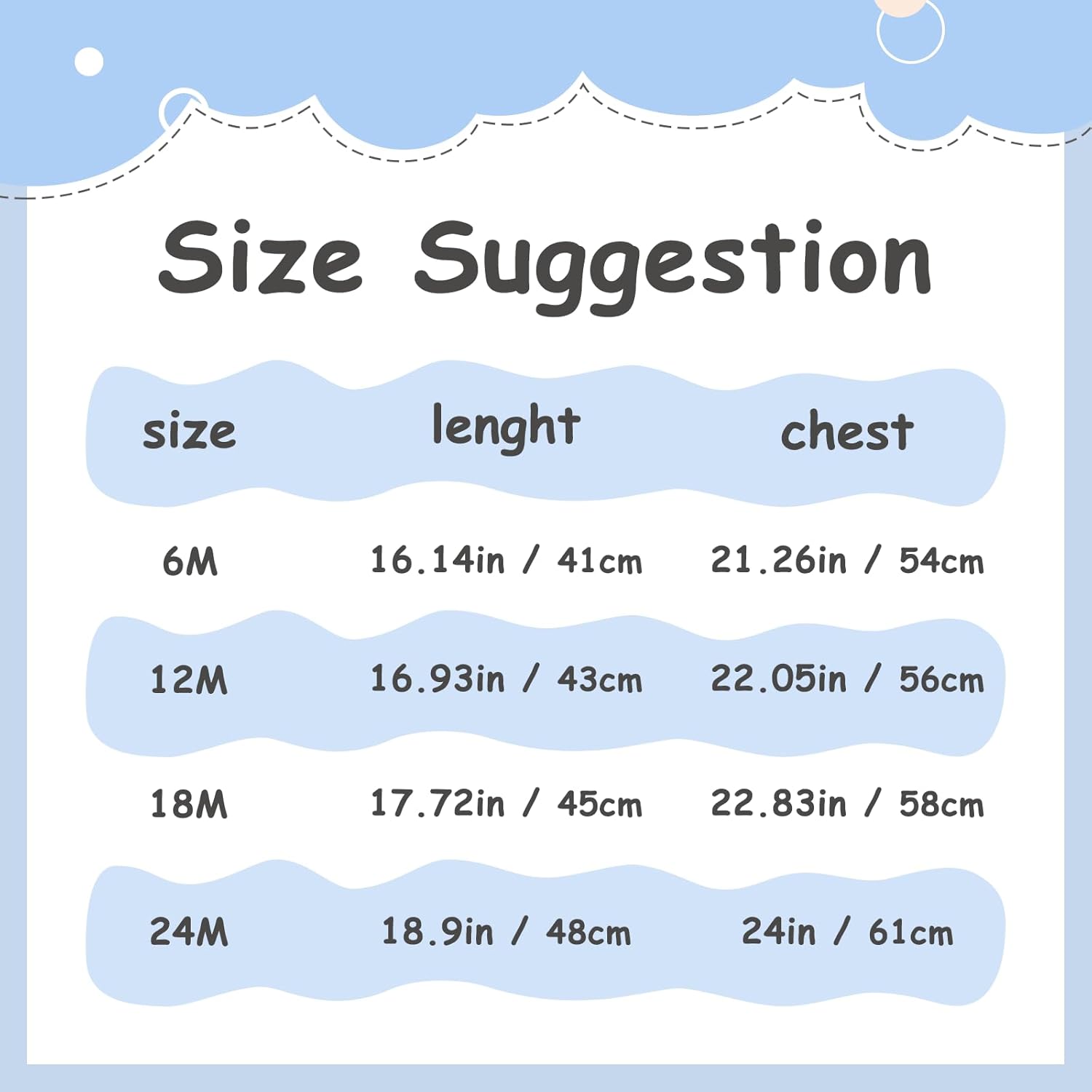 4 Sizes: 6M/12M/18M/24M(see picture size table for specific size), suitable for babies from 6 months to 2 years old.