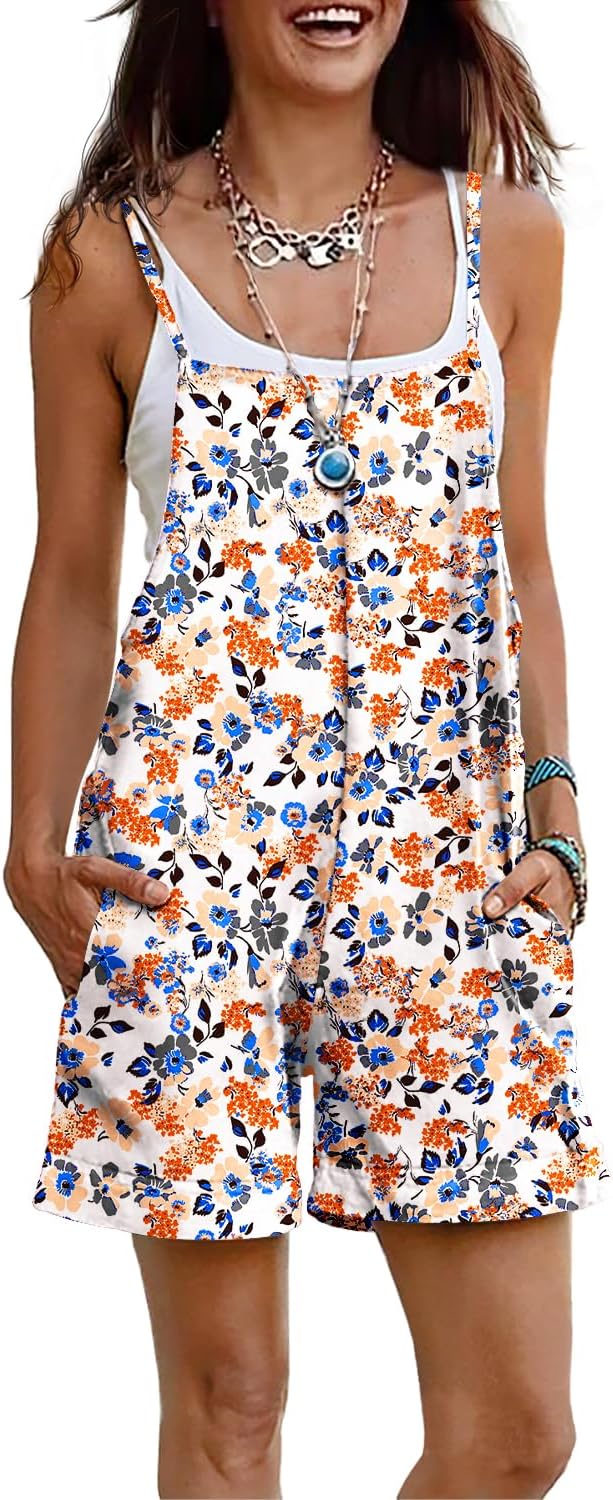 YESNO Women Summer Casual Loose Rompers Sleeveless Boho Floral Spaghetti Straps Shorts Overalls Jumpsuit with Pockets PH2